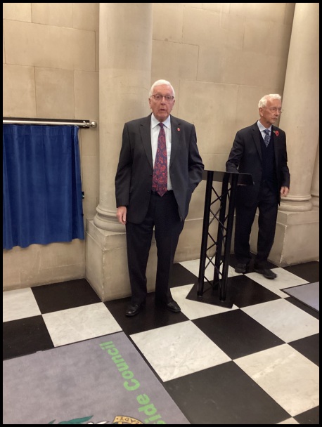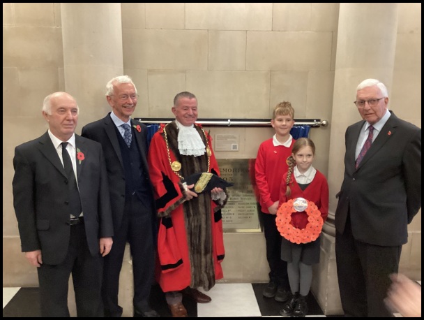 The council agreed to site the plaque in foyer of the main entrance. Sir David Chapman and Peter Chapman grandsons of Colonel Robert Chapman who originally unveiled the plaque in September 1920 agreed to unveil the plaque. The ceremony took place on Thursday 6th November. Itinerary: 10.50 Terry Ford told the history of the plaque, Peter Chapman talked about his Grandfather’s involvement, the Mayor Jay Potts read a poem about WW1, 11.00 the plaque was unveiled by Sir David Chapman. Two children from Harton Primary School laid a wreath on the plaque.